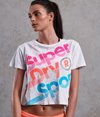 Naisten lyhyt Superdry Hyper Sport Label -T-paita. Tämä lyhyt t-paita sopii täydellisesti kerrospukeutumiseen. Paidan edessä on suuri Superdry Sport -akryylilogo ja takana suuri numeropainatus.